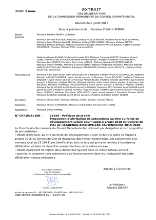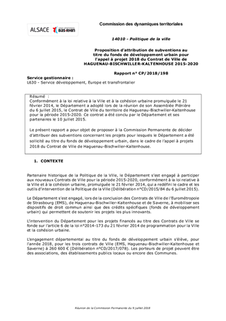 Conformément à la loi relative à la Ville et à la cohésion urbaine promulguée le 21 février 2014, le Département a adopté lors de la réunion de son Assemblée Plénière du 6 juillet 2015, le Contrat de Ville du territoire de Haguenau-Bischwiller-Kaltenhouse pour la période 2015-2020. Ce contrat a été conclu par le Département et ses partenaires le 10 juillet 2015. Le présent rapport a pour objet de proposer à la Commission Permanente de décider d’attribuer des subventions concernant les projets pour lesquels le Département a été sollicité au titre du fonds de développement urbain, dans le cadre de l’appel à projets 2018 du Contrat de Ville de Haguenau-Bischwiller-Kaltenhouse.