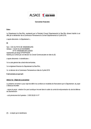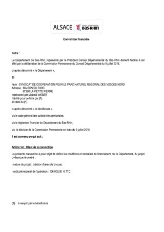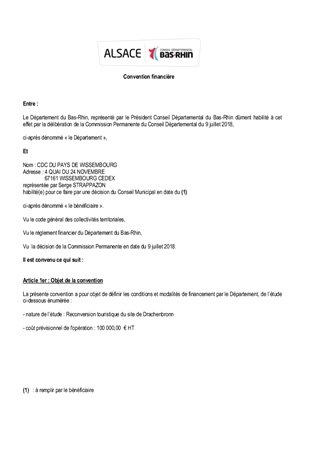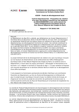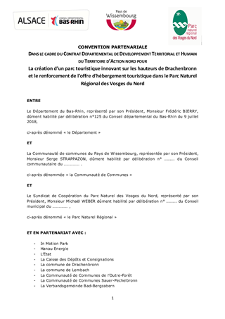 Le Département du Bas-Rhin a décidé, par délibérations du Conseil Départemental n° CD/2016/158 du 8 décembre 2016 et CD/2017/004 du 20 mars 2017, de développer un partenariat renforcé avec les acteurs locaux en mettant en œuvre des contrats départementaux de développement territorial et humain. Ces contrats constituent le volet stratégique du partenariat engagé par le Département avec les acteurs locaux sur la période 2018–2021. Ils ont vocation à traduire l’ambition collective à l’échelle de chaque territoire d’action du Département et à définir les enjeux prioritaires d’aménagement et de développement co-construits avec les acteurs des territoires. Dans ce cadre, le Conseil Départemental a approuvé le contrat départemental de développement territorial et humain du territoire d’Action Nord, le 11 décembre 2017 (CD/2017/077). Le projet d’attractivité et de développement de création d’un parc touristique innovant sur les hauteurs de Drachenbronn et de renforcement de l’offre d’hébergement touristique dans le Parc Naturel Régional des Vosges du Nord, co-construit avec le Département, s’inscrit dans les enjeux prioritaires « Développer le thermalisme et le tourisme » et « Adapter le territoire à l’avancée en âge ». Il a pour ambition d’impulser une nouvelle dynamique sur le territoire d’Action Nord en misant sur le développement d’une offre touristique. Il est proposé à la Commission permanente de décider d'attribuer une contribution financière du Département, au titre du Fonds de Développement et d’Attractivité, pour le projet de parc touristique innovant et pour la création d’aires de bivouac, et d’approuver les termes du projet de convention de partenariat à conclure avec la Communauté de communes du Pays de Wissembourg et le Syndicat de Coopération du Parc Naturel des Vosges du Nord.