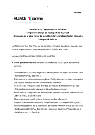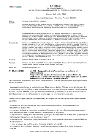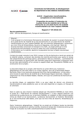 Il est proposé à la Commission Permanente de décider de soutenir le projet d’extension de la plate-forme de mobilité de la Ville de Karlsruhe en une plate-forme de mobilité transfrontalière sur tout l’espace PAMINA. Par une extension géographique, notamment aux trois Villes de Wissembourg, Saverne et Haguenau, ainsi que par l’ajout de diverses données concernant le transport et le trafic, ce projet porté par la Ville de Karlsruhe doit permettre la mise en place d’un outil numérique performant d’information sur la mobilité, destiné à la population de tout le bassin économique transfrontalier.