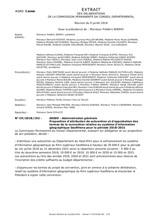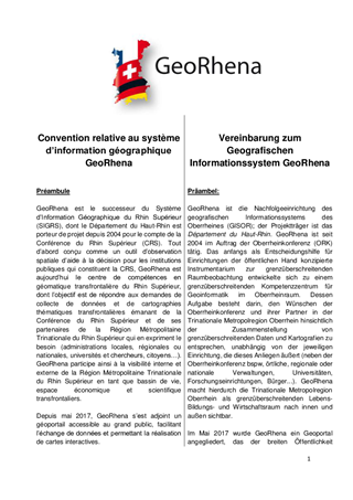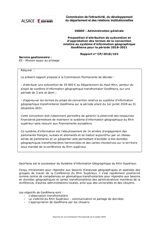 Le présent rapport propose à la Commission Permanente de décider : - d'attribuer une subvention de 35 000 € au Département du Haut-Rhin, porteur du projet de système d'information géographique transfrontalier GeoRhena, sur une période de 3 ans et demi ; - d’approuver les termes du projet de convention relative au système d’information géographique transfrontalier GeoRhena sur la période allant du 1er juillet 2018 au 31 décembre 2021. Cette convention doit notamment permettre de garantir la pérennité des ressources financières permettant de maintenir le système d’information géographique du Rhin supérieur sans recourir aux financements européens. Ce système d’information est l’aboutissement de 14 années d’engagement des partenaires français, suisses et allemands et se traduit aujourd’hui par un réseau solide de partenaires et un géoportail web permettant d’accéder à des données géographiques transfrontalières harmonisées et des cartes interactives sur le territoire sous mandat de la conférence du Rhin supérieur.