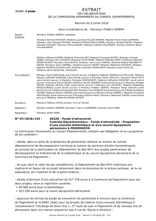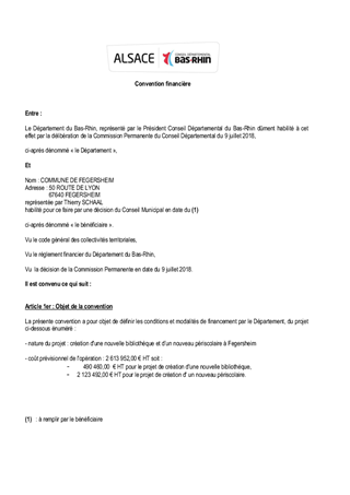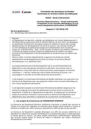 Le Département du Bas-Rhin a décidé, par délibération du Conseil Départemental n° CD/2016/158 du 8 décembre 2016 et CD/2017/004 du 20 mars 2017, de développer un partenariat renforcé avec les acteurs locaux en mettant en œuvre des contrats départementaux de développement territorial et humain. Ces contrats constituent le volet stratégique du partenariat engagé par le Département avec les acteurs locaux sur la période 2018 – 2021. Ils ont vocation à traduire une ambition collective à l’échelle de chaque territoire d’action du Département et à définir les enjeux prioritaires d’aménagement et de développement co-construits avec les acteurs des territoires. Dans ce cadre, le Conseil départemental a approuvé les termes du contrat départemental de développement territorial et humain du territoire d’Action Eurométropole, le 11 décembre 2017. Les projets d’attractivité et de développement de la nouvelle bibliothèque de Fegersheim et d'un équipement périscolaire à Ohnheim, co-construits avec le Département, s’inscrivent dans les enjeux prioritaires «accompagner la transition numérique », « faciliter l'accès pour tous à toutes les formes de culture » et « accompagner le maintien d'une offre de services de proximité ». Il est proposé à la Commission Permanente de décider d’attribuer une subvention à la Commune de Fegersheim pour ses projets de création d’une nouvelle bibliothèque et d’un nouvel équipement périscolaire. Il est également proposé à la Commission Permanente de décider d’approuver les termes du projet de convention de partenariat à conclure entre la Commune de Fegersheim, la DRAC et le Département du Bas-Rhin, et d’approuver les termes du projet de convention financière à conclure entre la Commune de Fegersheim et le Département pour permettre le versement de la subvention correspondante.