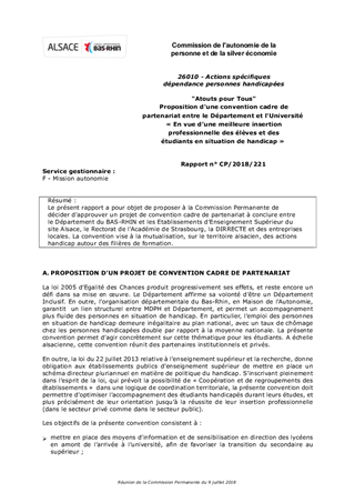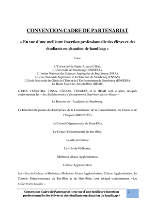 Le présent rapport a pour objet de proposer à la Commission Permanente de décider d'approuver un projet de convention cadre de partenariat à conclure entre le Département du BAS-RHIN et les Etablissements d'Enseignement Supérieur du site Alsace, le Rectorat de l'Académie de Strasbourg, la DIRRECTE et des entreprises locales. La convention vise à la mutualisation, sur le territoire alsacien, des actions handicap autour des filières de formation.