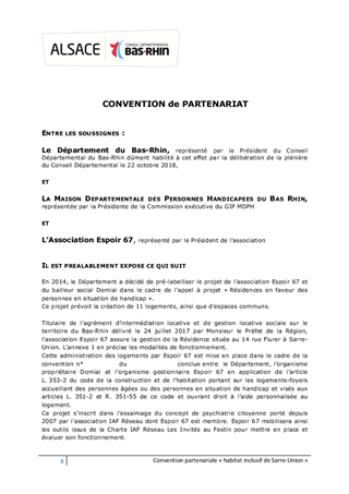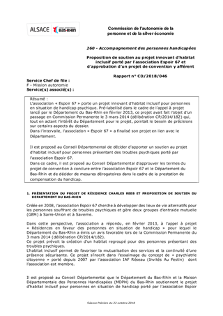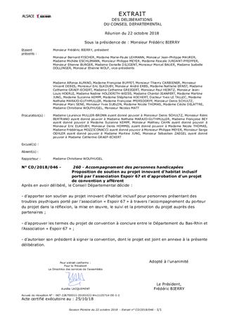 L’association « Espoir 67 » porte un projet innovant d’habitat inclusif pour personnes en situation de handicap psychique. Pré-labellisé dans le cadre de l’appel à projet lancé par le Département du Bas-Rhin en février 2013, ce projet avait fait l’objet d’un passage en Commission Permanente le 3 mars 2014 (délibération CP/2014/182) qui, tout en actant l’intérêt du Département pour le projet, pointait le besoin de précisions sur certains aspects du dossier. Dans l’intervalle, l’association « Espoir 67 » a finalisé son projet en lien avec le Département. Il est proposé au Conseil Départemental de décider d'apporter un soutien au projet d'habitat inclusif pour personnes présentant des troubles psychiques porté par l'association Espoir 67. Dans ce cadre, il est proposé au Conseil Départemental d’approuver les termes du projet de convention à conclure entre l’association Espoir 67 et le Département du Bas-Rhin et de décider de mesures dérogatoires dans le cadre de la prestation de compensation du handicap.