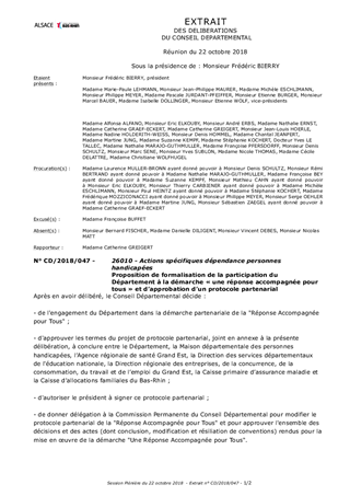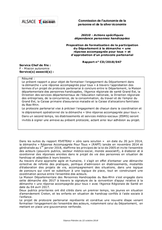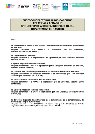 Le présent rapport a pour objet de formaliser l’engagement du Département dans la démarche « une réponse accompagnée pour tous » à travers l’approbation des termes d’un projet de protocole partenarial à conclure entre le Département, la Maison départementale des personnes handicapées, l’Agence régionale de santé Grand Est, la Direction des services départementaux de l’éducation nationale, la Direction régionale des entreprises, de la concurrence, de la consommation, du travail et de l’emploi du Grand Est, la Caisse primaire d’assurance maladie et la Caisse d’allocations familiales du Bas-Rhin. Le protocole partenarial vise à préciser l’engagement de chacun dans la coordination et le déploiement opérationnel de la démarche « Une réponse accompagnée pour tous ». Dans un second temps, les établissements et services médico-sociaux (ESMS) seront invités à signer une annexe au présent protocole, actant ainsi leur adhésion au projet.