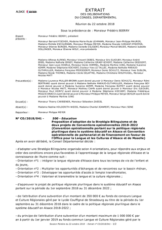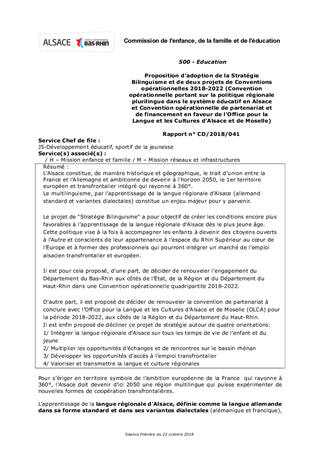 Proposition d'adoption de la Stratégie Bilinguisme et de deux projets de Conventions opérationnelles 2018-2022 (Convention opérationnelle portant sur la politique régionale plurilingue dans le système éducatif en Alsace et Convention opérationnelle de partenariat et de financement en faveur de l’Office pour la Langue et les Cultures d’Alsace et de Moselle)