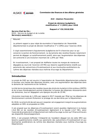 Le présent rapport a pour objet de soumettre à l’approbation de l’Assemblée départementale le projet de décision modificative n° 2 (DM2) pour l’exercice 2018. Il s’agit essentiellement d’ajustements budgétaires de fin d’exercice pour ce qui concerne la section de fonctionnement. Le dynamisme des recettes fiscales notamment permet de dégager un autofinancement positif, alors que l’augmentation des dépenses est contrainte à une évolution maximale de 1,29% par l'Etat. En investissement, il est proposé de réaffecter toutes les marges de manœuvre dégagées au cours de l’exercice (24 M€) aux besoins supplémentaires relatifs aux paiements des subventions d’investissement et aux éventuelles accélérations du rythme des dépenses réalisées sous maîtrise d’ouvrage du Département.