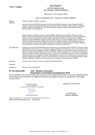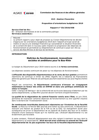 Le présent rapport a pour objet de proposer au Conseil Départemental de décider d’approuver les orientations budgétaires 2019 dont l’objectif principal serait de mettre en œuvre une stratégie financière qui consoliderait la situation financière de la collectivité dans le nouveau cadre imposé à la progression des dépenses de fonctionnement et permettrait au Département de continuer à jouer son rôle au service des Bas-Rhinois et de tous les territoires.