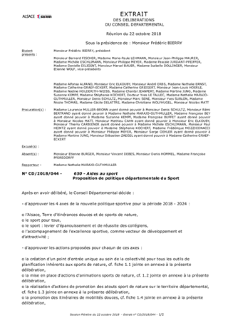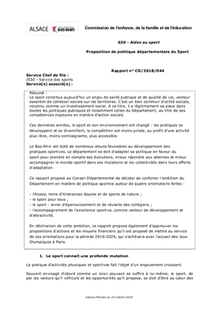 Le sport constitue aujourd’hui un enjeu de santé publique et de qualité de vie, vecteur essentiel de cohésion sociale sur les territoires. C’est un bien commun d’utilité sociale, reconnu comme un investissement social. A ce titre, il a légitimement sa place dans toutes les politiques publiques et notamment celles du Département, au titre de ses compétences majeures en matière d’action sociale. Ces dernières années, le sport et son environnement ont changé : les pratiques se développent et se diversifient, la compétition est moins prisée, au profit d’une activité plus libre, moins contraignante, plus accessible. Le Bas-Rhin est doté de nombreux atouts favorables au développement des pratiques sportives. Le département se doit d’adapter sa politique en faveur du sport pour prendre en compte ses évolutions, mieux répondre aux attentes et mieux accompagner le monde sportif dans ses mutations et les collectivités dans leurs efforts d'adaptation. Ce rapport propose au Conseil Départemental de décider de conforter l'ambition du Département en matière de politique sportive autour de quatre orientations fortes : - l’Alsace, terre d'itinérances douces et de sports de nature ; - le sport pour tous ; - le sport : levier d'épanouissement et de réussite des collégiens ; - l’accompagnement de l'excellence sportive, comme vecteur de développement et d’attractivité. En déclinaison de cette ambition, ce rapport propose également d’approuver les propositions d’actions et les moyens financiers qu'il est proposé de mettre au service de ces orientations pour la période 2018-2024, qui s’achèvera avec l’accueil des Jeux Olympiques à Paris.