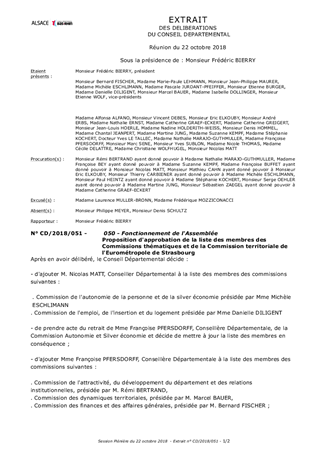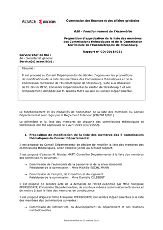 Il est proposé au Conseil Départemental de décider d'approuver les propositions de modifications de la liste des membres des Commissions thématiques et de la Commission territoriale de l'Eurométropole de Strasbourg, suite à la démission de M. Olivier BITZ, Conseiller Départemental du canton de Strasbourg 5 et son remplacement immédiat par M. Nicolas MATT au sein du Conseil Départemental.