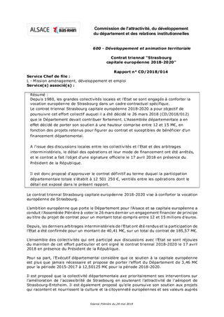 Depuis 1980, les grandes collectivités locales et l'Etat se sont engagés à conforter la vocation européenne de Strasbourg dans un cadre contractuel spécifique. Le contrat triennal Strasbourg capitale européenne 2018-2020 a pour objectif de poursuivre cet effort collectif auquel il a été décidé le 26 mars 2018 (CD/2018/012) que le Département devait contribuer fortement. L'Assemblée départementale a en effet décidé de porter son soutien à une hauteur comprise entre 12 et 15 M€, en fonction des projets retenus pour figurer au contrat et suceptibles de bénéficier d'un financement départemental. A l'issue des discussions locales entre les collectivités et l'Etat et des arbitrages interministériels, le détail des opérations et leur mode de financement ont été arrêtés, et le contrat a fait l'objet d'une signature officielle le 17 avril 2018 en présence du Président de la République. Il est donc proposé d'approuver le contrat définitif au terme duquel la participation départementale totale s'établit à 12 501 250 €, ventilés entre les opérations dont le détail est exposé dans le présent rapport.