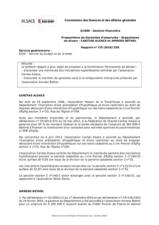Le présent rapport a pour objet de proposer à la Commission Permanente de décider : - d’accorder une mainlevée des inscriptions hypothécaires sollicitée par l’association Caritas Alsace, - d’accorder le maintien de garanties suite à la renégociation d’emprunts présenté par l’association Amreso Bethel.