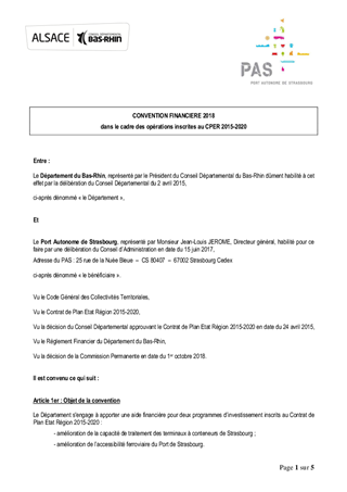 Le présent rapport a pour objet de proposer à la Commission Permanente de décider des modalités financières d'intervention du Département pour l'amélioration de l’accessibilité ferroviaire du Port de Strasbourg et l'augmentation de sa capacité de traitement des terminaux à conteneurs, sous la maîtrise d'ouvrage du Port Autonome de Strasbourg, conformément aux engagements du Contrat de Plan Etat-Région 2015-2020, et de décider d'attribuer dans ce cadre un financement maximal du Département de 291 000 €.
