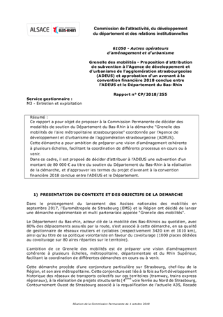 Ce rapport a pour objet de proposer à la Commission Permanente de décider des modalités de soutien du Département du Bas-Rhin à la démarche "Grenelle des mobilités de l'aire métropolitaine strasbourgeoise" coordonnée par l'Agence de développement et d'urbanisme de l'agglomération strasbourgeoise (ADEUS). Cette démarche a pour ambition de préparer une vision d'aménagement cohérente à plusieurs échelles, facilitant la coordination de différents processus en cours ou à venir. Dans ce cadre, il est proposé de décider d’attribuer à l’ADEUS une subvention d'un montant de 80 000 € au titre du soutien du Département du Bas-Rhin à la réalisation de la démarche, et d'approuver les termes du projet d'avenant à la convention financière 2018 conclue entre l'ADEUS et le Département.