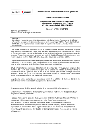 Le présent rapport a pour objet de proposer à la Commission Permanente de décider d’accorder une garantie d’emprunt pour un prêt souscrit par l’Office Public de l’Habitat OPUS 67 pour l’opération de construction de logements situés 1A rue du Buis à Drusenheim.