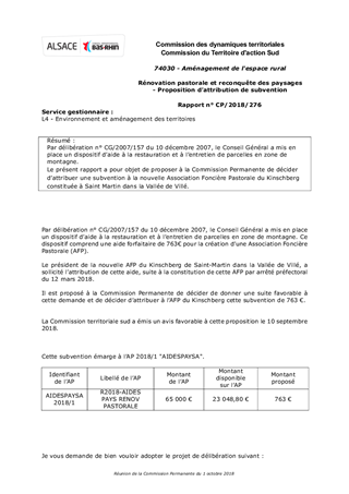 Par délibération n° CG/2007/157 du 10 décembre 2007, le Conseil Général a mis en place un dispositif d’aide à la restauration et à l’entretien de parcelles en zone de montagne. Le présent rapport a pour objet de proposer à la Commission Permanente de décider d’attribuer une subvention à la nouvelle Association Foncière Pastorale du Kinschberg constituée à Saint Martin dans la Vallée de Villé.