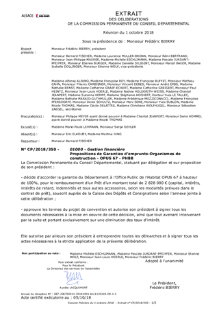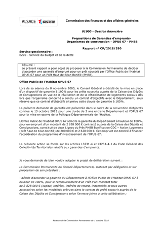 Le présent rapport a pour objet de proposer à la Commission Permanente de décider d’accorder une garantie d’emprunt pour un prêt souscrit par l’Office Public de l’Habitat OPUS 67 pour un Prêt Haut de Bilan Bonifié (PHBB).