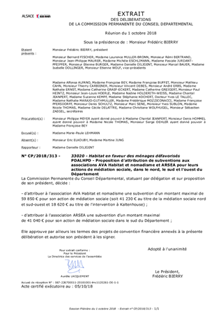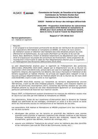 Il est proposé à la Commission permanente de décider de l'attribution de subventions aux associations AVA Habitat et nomadisme et ARSEA, en faveur de leurs actions de médiation sociale à l'attention des habitants des sites d'habitat précaire du nord (Mertzwiller et Kaltenhouse), du sud-ouest (Muhlbach sur Bruche) et du sud (St Pierre, Barr, Boofzheim, Erstein et Sélestat notamment) du département pour l'année 2018 et d'approuver les projets de conventions de financement. Cette proposition de reconduction s’inscrit dans le cadre du Plan Départemental d’Action pour le Logement et l’Hébergement des Personnes Défavorisées 2015-2020.