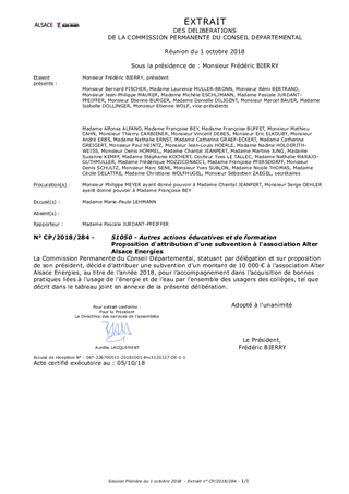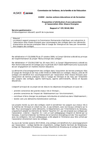 Le présent rapport propose à la Commission Permanente d'attribuer une subvention à l'association Alter Alsace Energies pour accompagner des collèges dans leur démarche d’acquisition de bonnes pratiques liées à l’usage de l’énergie et de l’eau par l’ensemble des usagers des collèges.