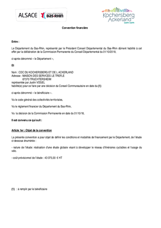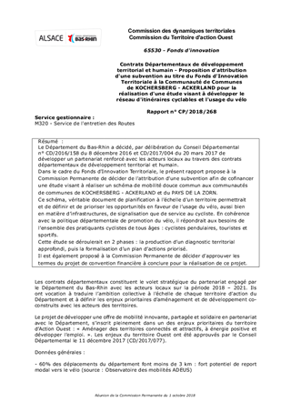 Le Département du Bas-Rhin a décidé, par délibération du Conseil Départemental n° CD/2016/158 du 8 décembre 2016 et CD/2017/004 du 20 mars 2017 de développer un partenariat renforcé avec les acteurs locaux au travers des contrats départementaux de développement territorial et humain. Dans le cadre du Fonds d'Innovation Territoriale, le présent rapport propose à la Commission Permanente de décider de l'attribution d'une subvention afin de cofinancer une étude visant à réaliser un schéma de mobilité douce commun aux communautés de communes de KOCHERSBERG - ACKERLAND et du PAYS DE LA ZORN. Ce schéma, véritable document de planification à l’échelle d’un territoire permettrait et de définir et de prioriser les opportunités en faveur de l’usage du vélo, aussi bien en matière d’infrastructures, de signalisation que de service au cycliste. En cohérence avec la politique départementale de promotion du vélo, il répondrait aux besoins de l’ensemble des pratiquants cyclistes de tous âges : cyclistes pendulaires, touristes et sportifs. Cette étude se déroulerait en 2 phases : la production d’un diagnostic territorial approfondi, puis la formalisation d’un plan d’actions priorisé. Il est également proposé à la Commission Permanente de décider d'approuver les termes du projet de convention financière à conclure pour la réalisation de ce projet.