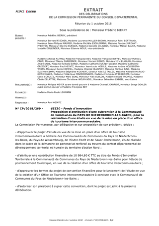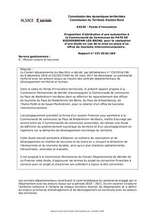 Le Conseil départemental du Bas-Rhin a décidé, par délibérations n° CD/2016/158 du 8 décembre 2016 et CD/2017/004 du 20 mars 2017 de développer un partenariat renforcé avec les acteurs locaux au travers des contrats départementaux de développement territorial et humain. Dans le cadre du Fonds d'innovation territoriale, le présent rapport propose à la Commission Permanente de décider d’accompagner la Communauté de communes du Pays de Niederbronn-les-Bains dans sa réflexion de rapprochement des offices de tourisme du Pays de Niederbronn-les-Bains, du Pays de Wissembourg, de l’Outre-Forêt et de Sauer-Pechelbronn, pour la création d’un office de tourisme intercommunautaire. L’accompagnement prendrait la forme d’un soutien financier pour permettre à la Communauté de communes du Pays de Niederbronn-les-Bains, maître d’ouvrage par accord entre les 3 Communautés de communes concernées, de réaliser une étude de définition du positionnement touristique du territoire et d’un accompagnement en ingénierie sur la démarche de développement touristique du territoire. Cette étude devrait permettre d’élaborer un scénario de valorisation et de développement en matière de tourisme et de loisirs en y incluant la dimension de l’écotourisme et du tourisme durable, ainsi qu’un plan d’actions opérationnelles, hiérarchisées, articulées et évaluées. Il est proposé à la Commission Permanente du Conseil Départemental de décider de co-financer cette étude, d'approuver les termes du projet de convention financière à conclure pour ce projet et d'autoriser son président à signer la dite convention.