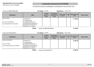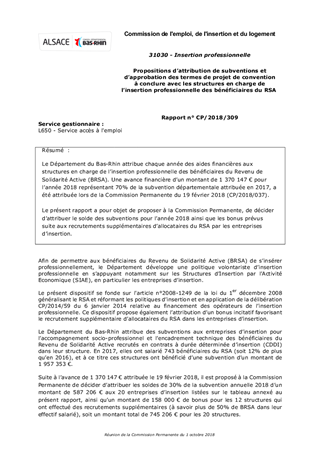 Le Département du Bas-Rhin attribue chaque année des aides financières aux structures en charge de l’insertion professionnelle des bénéficiaires du Revenu de Solidarité Active (BRSA). Une avance financière d’un montant de 1 370 147 € pour l’année 2018 représentant 70% de la subvention départementale attribuée en 2017, a été attribuée lors de la Commission Permanente du 19 février 2018 (CP/2018/037). Le présent rapport a pour objet de proposer à la Commission Permanente, de décider d’attribuer le solde des subventions pour l’année 2018 ainsi que les bonus prévus suite aux recrutements supplémentaires d’allocataires du RSA par les entreprises d’insertion.