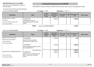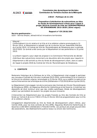 Conformément à la loi relative à la Ville et à la cohésion urbaine promulguée le 21 février 2014, le Département a adopté lors de la réunion de son Assemblée Plénière du 6 juillet 2015, le Contrat de Ville de l’Eurométropole de Strasbourg pour la période 2015-2020. Ce contrat a été conclu par le Département et ses partenaires le 10 juillet 2015. Le présent rapport a pour objet de proposer à la Commission Permanente de décider d’attribuer des subventions concernant une deuxième série de projets pour laquelle le Département a été sollicité au titre du fonds de développement urbain, dans le cadre de l’appel à projets 2018 du Contrat de Ville de l’Eurométropole de Strasbourg.