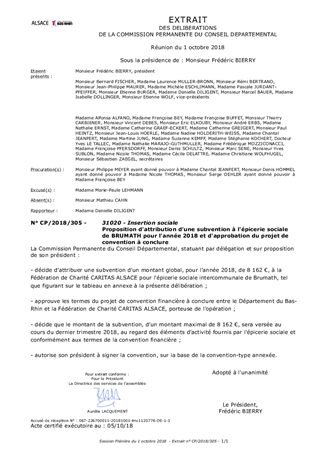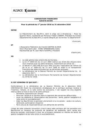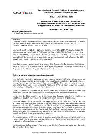 Le Département du Bas-Rhin attribue chaque année des aides financières aux épiceries sociales ainsi qu’à des opérateurs spécifiques qui contribuent par leur action à l’insertion sociale des allocataires du RSA. Le département comptait 17 épiceries sociales jusqu'à fin 2017. Une épicerie sociale intercommunale, portée par la Fédération de Charité CARITAS ALSACE, a ouvert ses portes à BRUMATH, en janvier 2018. Grâce à l’implication de 20 bénévoles, elle se fixe pour objectif de permettre à une centaine de familles, dont des bénéficiaires du RSA, d’accéder à des produits de première nécessité. Le présent rapport a pour objet de proposer à la Commission Permanente l'attribution d'une subvention d'un montant de 8 162 € à cette épicerie sociale pour l’année 2018 et d'approuver les termes du projet de convention à conclure.