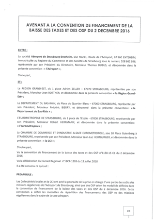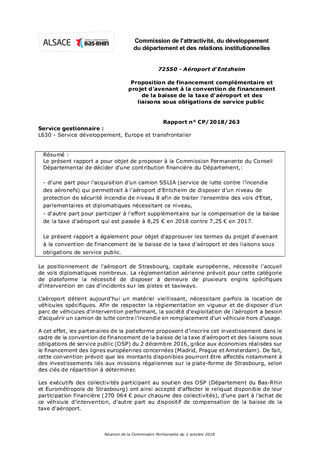 Le présent rapport a pour objet de proposer à la Commission Permanente du Conseil Départemental de décider d'une contribution financière du Département,: - d’une part pour l'acquisition d’un camion SSLIA (service de lutte contre l’incendie des aéronefs) qui permettrait à l’aéroport d'Entzheim de disposer d’un niveau de protection de sécurité incendie de niveau 8 afin de traiter l’ensemble des vols d’Etat, parlementaires et diplomatiques nécessitant ce niveau, - d'autre part pour participer à l'effort supplémentaire sur la compensation de la baisse de la taxe d’aéroport qui est passée à 8,25 € en 2018 contre 7,25 € en 2017. Le présent rapport a également pour objet d'approuver les termes du projet d'avenant à la convention de financement de la baisse de la taxe d'aéroport et des liaisons sous obligations de service public.