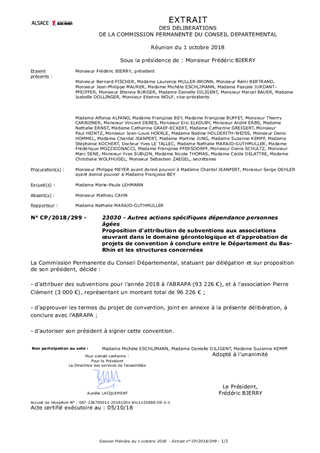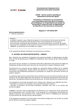 Le présent rapport a pour objet de proposer à la Commission Permanente de décider d'attribuer des subventions de fonctionnement à des associations et structures oeuvrant dans le domaine gérontologique, ainsi que d’approuver les termes du projet de convention d'objectifs et de moyens à conclure entre le Département du Bas-Rhin et l’ABRAPA, et d’autoriser son président à la signer.