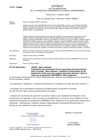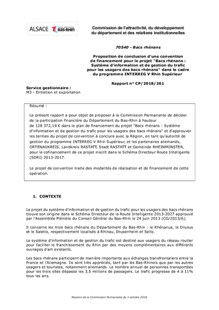 Le présent rapport a pour objet de proposer à la Commission Permanente de décider de la participation financière du Département du Bas-Rhin à hauteur de 128 372,19 € dans le plan de financement du projet "Bacs rhénans : Système d’information et de gestion du trafic pour les usagers des bacs rhénans" et d'approuver les termes du projet de convention à conclure avec la Région, en tant qu’autorité de gestion du programme INTERREG V Rhin Supérieur, et les partenaires allemands, ORTENAUKREIS, Landkreis RASTATT, Stadt RASTATT et Gemeinde RHEINMÜNSTER, pour le cofinancement de ce projet inscrit dans le Schéma Directeur Route Intelligente (SDRI) 2013-2017. Le projet de convention traite des modalités de réalisation et de financement de cette opération.