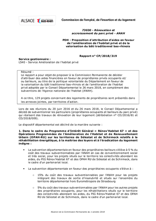 Le rapport a pour objet de proposer à la Commission Permanente de décider d'attribuer des aides financières en faveur de propriétaires privés occupants et/ou bailleurs, au titre de la politique volontariste du Département en faveur de la valorisation du bâti traditionnel bas-rhinois et de l'amélioration de l'habitat privé adoptée par le Conseil Départemental le 26 mars 2018, en complément des subventions de l'Agence nationale de l'habitat (ANAH). A ce titre, 129 projets concernant des logements de propriétaires sont présentés dans les annexes jointes, par territoires d'action.