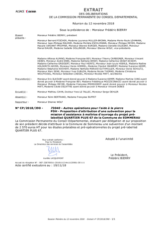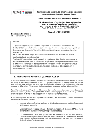 Le présent rapport a pour objet de proposer à la Commission Permanente de décider d'attribuer à la Commune de Sommerau (Commune nouvelle regroupant les Communes de Salenthal, Allenwiller, Birkenwald et Singrist) une subvention d'un montant de 2 570 € HT pour son projet pré-labellisé Quartier Plus 67, au titre des études préalables et pré-opérationnelles. Ce dispositif volontariste vise à soutenir la production d’un foncier « accessible » aux bailleurs sociaux pour la réalisation d’opérations de logements locatifs sociaux et à favoriser l’émergence de logements en accession sociale à la propriété, tout en encourageant les opérations exemplaires en matière de développement et d’aménagement durable.