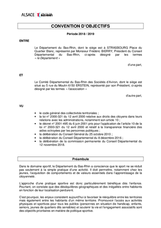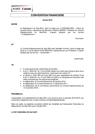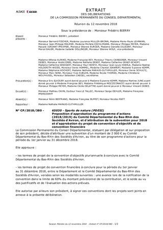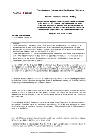 Dans le cadre des compétences du Département en matière de sports de nature, le présent rapport a pour objet de proposer à la Commission Permanente de décider d'approuver le programme d'actions proposé par le Comité Départemental du Bas-Rhin des Sociétés d'Aviron pour les années 2018 et 2019. Il est aussi proposé à la Commission Permanente de décider d'attribuer une subvention au Comité Départemental du Bas- Rhin des Sociétés d'Aviron pour l'année 2018 ainsi que d'approuver les termes des projets de convention d'objectifs et de convention financière à conclure avec ce comité.