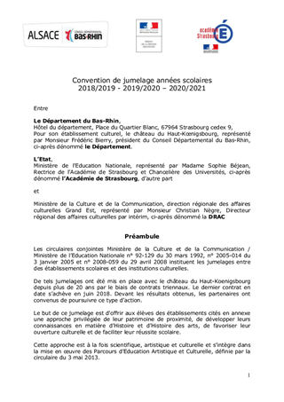 Dans le cadre de ses activités éducatives, le château du Haut-Koenigsbourg, équipement culturel de proximité, a depuis de nombreuses années initié ce projet autour du Moyen Age impliquant plusieurs dizaines d'établissements scolaires. Ce dispositif national tripartite est mené conjointement entre le Département du Bas-Rhin, propriétaire du château du Haut-Koenigsbourg, le Ministère de l'Education Nationale et le Ministère de la Culture. Aussi, il est proposé à la Commission Permanente de décider de poursuivre ce partenariat et d'impulser une nouvelle dynamique pour les trois années scolaires à venir (2018-2021) autour des objectifs suivants: - Rapprocher le public scolaire de son patrimoine environnant, - Développer ses connaissances en matière d'Histoire, d’histoire des Arts, - Favoriser son épanouissement culturel en visant sa réussite scolaire. Dans un souci d'équité territorial, le Ministère de l'Education Nationale définit chaque année le territoire concerné en concertation avec les partenaires du projet. Pour l'année scolaire 2018/2019, cette action éducative et culturelle toucherait plus particulièrement les écoles et établissements scolaires de la circonscription de Sélestat. L'action du Département qui a vocation chaque année à toucher de nouveaux territoires, serait valorisée à travers l'ouverture à titre gracieux du château (ateliers, visites théâtralisées...), la mise à disposition de ses espaces pédagogiques et la mobilisation du service éducatif du monument pour concevoir et animer une démarche co-construite touchant près de 400 élèves et 16 classes au total. L'engagement financier du Département pour cette action est évalué à 6 000 €. Il est proposé à la Commission Permanente de décider de renouveler le jumelage entre le château du Haut-Kœnigsbourg et les établissements scolaires de la circonscription de Sélestat et de valoriser la participation du Département à hauteur de 6 000 € pour les années scolaires 2018/2019, 2019/2020 et 2020/2021.
