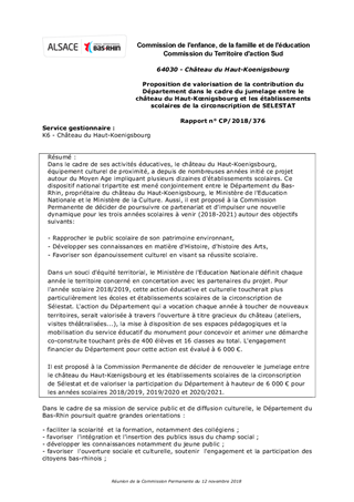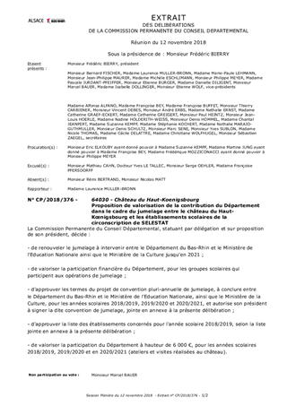 Proposition de valorisation de la contribution du Département dans le cadre du jumelage entre le château du Haut-Kœnigsbourg et les établissements scolaires de la circonscription de SELESTAT