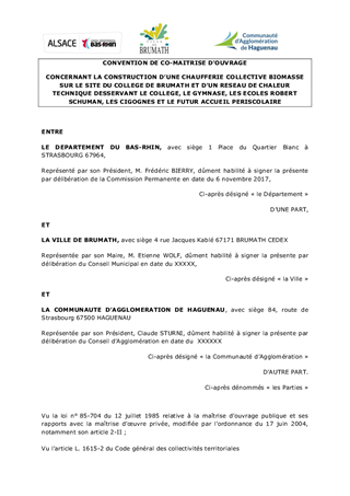 Il est proposé que la Ville de Brumath, la Communauté d’Agglomération de Haguenau et le Département du Bas-Rhin construisent en commun, une chaufferie collective biomasse et un réseau de chaleur technique entre plusieurs de leurs bâtiments sis sur le territoire de Brumath. Cette opportunité de mutualiser la production de chaleur entre le collège, les écoles primaires Schuman et Cigognes, le gymnase et le futur accueil périscolaire entre pleinement dans les objectifs de transition énergétiques portés par les trois collectivités publiques. Le présent rapport a pour objet de proposer à la Commission Permanente de décider : - de la construction en commun de cette chaufferie collective et de son réseau de chaleur technique par les trois personnes publiques précitées, - d’approuver la répartition de l’enveloppe financière du projet, - de la réalisation de ces travaux sous la forme d’une co-maîtrise d’ouvrage, - que le Département est le maître d’ouvrage désigné, - de l’application du régime de l’indivision aux ouvrages construits entre les trois maîtres d’ouvrage, - d'approuver le projet de construction à conclure, précisant le principe de l’exploitation, la maintenance et l’entretien de la chaufferie par un prestataire extérieur choisi suite à mise en concurrence dans le cadre d’une convention de groupement de commande dont le coordonnateur pressenti serait la Ville de Brumath, - et d’autoriser le président à signer la convention de co-maitrise d’ouvrage correspondante.