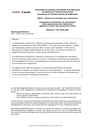 Le Département du Bas-Rhin a affirmé sa politique jeunesse dans le Plan d’actions Enfance Jeunesse Famille 2018-2023 (PAEJF), « Un avenir pour nos enfants », adopté par l'Assemblée plénière le 25 juin 2018. Ce plan vient compléter le Plan Actions Educatives et Collèges (PAEC) adopté le 20 mars 2017, et confirmer l'ambition du Département pour construire l’avenir des jeunes Bas-Rhinois. Le Département du Bas-Rhin contribue à l'autonomie et à l’engagement des jeunes avec une attention particulière pour les plus vulnérables en soutenant les associations qui développent des actions socio-éducatives en direction des jeunes de 10 à 25 ans et qui favorisent leur engagement. Ce rapport a pour objet de proposer à la Commission Permanente de décider d'attribuer un soutien aux actions menées par trois associations : la maison des jeunes et de la culture de Barembach, le centre culturel et social Rotterdam de Strasbourg et le centre socioculturel l'Albatrosde Lingolsheim.