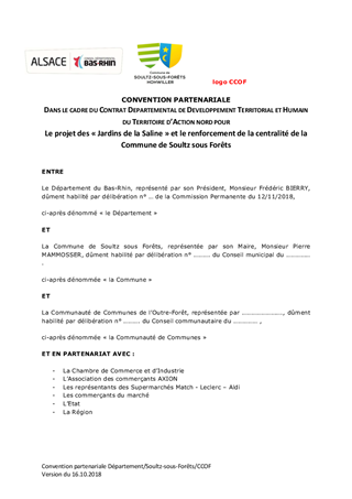 Le Conseil départemental du Bas-Rhin a décidé, par délibérations n° CD/2016/158 du 8 décembre 2016 et CD/2017/004 du 20 mars 2017 du développement d'un partenariat renforcé entre le Département et les acteurs locaux au travers de contrats départementaux de développement territorial et humain. Ces contrats constituent le volet stratégique du partenariat engagé par le Département avec les acteurs locaux sur la période 2018 – 2021. Ils ont vocation à traduire l’ambition collective à l’échelle de chaque territoire d’action du Département et à définir les enjeux prioritaires d’aménagement et de développement co-construits avec les acteurs des territoires. Dans ce cadre, le Conseil départemental a approuvé le contrat départemental de développement territorial et humain du territoire d’Action Nord le 11 décembre 2017 (CD/2017/077) Le projet d’attractivité et de développement visant au renforcement de la centralité de la Commune de Soultz sous Forêts par l’aménagement des «Jardins de la Saline», co-construit avec le Département, s’inscrit dans les enjeux prioritaires « Conforter, maintenir et pérenniser l’offre de service public » et « Faire de la culture un réel levier d’attractivité ». Il est proposé à la Commission Permanente de décider d’attribuer une subvention du Département, au titre du Fonds de développement et d’attractivité, pour le projet d’aménagement des « Jardins de la Saline » à Soultz sous Forêts, et d’approuver les termes du projet de convention partenariale à conclure avec la Commune de Soultz sous Forêts et la Communauté de Communes de l’Outre-Forêt, ainsi que le projet de convention financière correspondant.