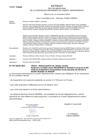 Le présent rapport a pour objet de proposer à la Commission Permanente de décider de l'acquisition d'une parcelle de terrain nécessaire à la réalisation de la liaison cyclable entre Molsheim et Saales sur le territoire de la commune de Saint-Blaise-La-Roche.