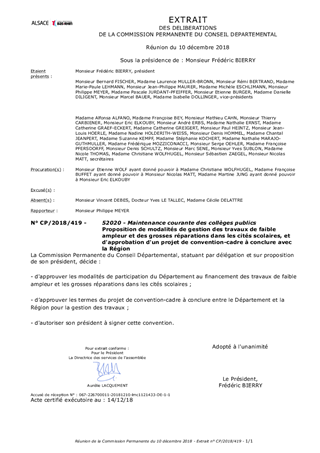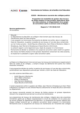 Le Département du Bas-Rhin et la Région interviennent pour des travaux de maintenance dans les cités scolaires. Il est proposé à la Commission Permanente de décider de confier, dans le respect du Code de l’éducation, la gestion complète de ces travaux à l’une des deux collectivités sur les 5 sites suivants : André Maurois à Bischwiller, Henri-Meck à Molsheim, Kléber à Strasbourg, Jean Monnet à Strasbourg et Haute Bruche à Schirmeck. Le présent rapport a ainsi également pour objet de proposer à la Commission Permanente de décider la validation d’un projet de convention cadre relatif à la gestion des travaux de faible ampleur et des grosses réparations concernant les cités scolaires, et d’autoriser le président à signer cette convention-cadre.