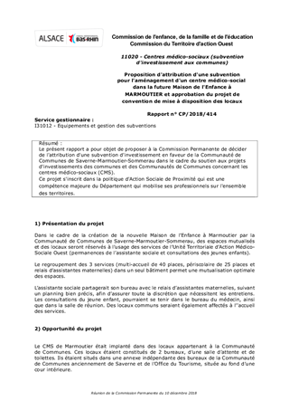 Le présent rapport a pour objet de proposer à la Commission Permanente de décider de l'attribution d'une subvention d'investissement en faveur de la Communauté de Communes de Saverne-Marmoutier-Sommerau dans le cadre du soutien aux projets d'investissements des communes et des Communautés de Communes concernant les centres médico-sociaux (CMS). Ce projet s'inscrit dans la politique d'Action Sociale de Proximité qui est une compétence majeure du Département qui mobilise ses professionnels sur l'ensemble des territoires.