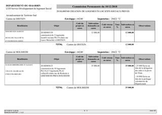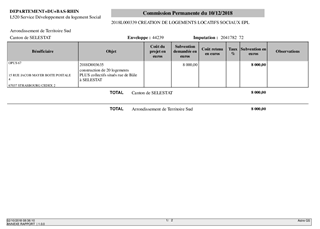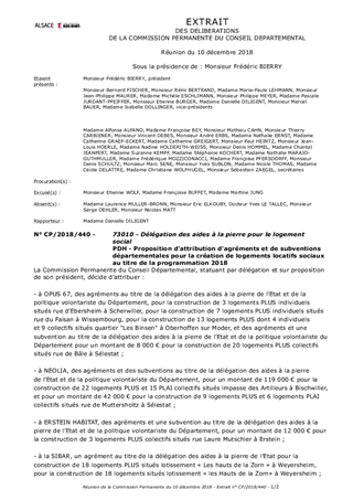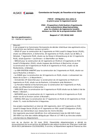 Il est proposé à la Commission Permanente de décider d’attribuer des agréments et/ou subventions aux bailleurs sociaux suivants : - OPUS 67 pour la construction de 3 logements en Prêt Locatif à Usage Social (PLUS), situés rue d’Ebersheim, à Scherwiller, 20 logements en PLUS, situés rue de Bâle, à Sélestat, 7 logements PLUS, situés rue du Faisan à Wissembourg et de 13 logements PLUS, situés Quartier « Les Binsen » à Oberhoffen sur Moder ; - NEOLIA pour la construction de 22 logements en PLUS et 14 logements en Prêt Locatif d’Intégration (PLAI), situés impasse des Artilleurs à Bischwiller, et pour la construction de 9 logements en PLUS et 6 logements en PLAI, situés rue de Muttersholtz, à Sélestat ; - La SEM ERSTEIN HABITAT pour la construction de 3 logements en PLUS, situés rue Laure Mutschler, à Erstein ; - La SIBAR pour la construction de 18 logements en PLUS, situés « Lotissement les Hauts de la Zorn », à Weyersheim ; - Immobilière 3F Grand Est pour la construction de 10 logements en PLUS et 5 logements en PLAI, situés rue de Rosheim, à Griesheim près Molsheim ; - La Foncière Habitat et Humanisme pour la construction de 4 logements en PLAI, situés rue d’Ebersheim à Scherwiller ; - AMELOGIS pour la construction de 4 logements en PLUS situés rue du Sable à Val de Moder / Uberach ; - BATIGERE pour la construction de 11 logements en PLUS et 8 logements en PLAI situés rue de la Division Leclerc à Brumath ; - DOMIAL ESH pour la construction de 17 logements en PLUS et 10 logements en PLAI situés 71, route de Bischwiller à Haguenau. Ces projets représentent un total de 184 logements, dont 137 logements en Prêt Locatif à Usage Social (PLUS) et 47 logements en Prêt Locatif d’Intégration (PLAI), destinés aux demandeurs aux ressources les moins élevées. Ces logements pourraient bénéficier d'un cofinancement total de 400 945 € dont 283 000 € au titre des crédits délégués par l'Etat et 117 945 € au titre des crédits volontaristes du Département.
