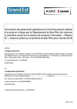 Suite au transfert de la compétence" transports interurbains" à la Région, le présent rapport a pour objet de proposer à la Commission Permanente de décider la prise en charge par le Département du Bas-Rhin des mesures à caractère social sur le réseau interurbain, pour l’année 2018, concernant les bénéficiaires du revenu de solidarité active (BRSA), les séniors de + 60 ans et les personnes à mobilité réduite. Il a également pour objet de proposer à la Commission Permanente de décider d'approuver les termes du projet de convention partenariale à conclure entre le Département du Bas-Rhin et la Région, relative à la prise en charge par le Département du Bas-Rhin pour l’année 2018 de mesures à caractère social sur le réseau de transport interurbain « Réseau 67 » mises en place sur le territoire du Bas- Rhin.