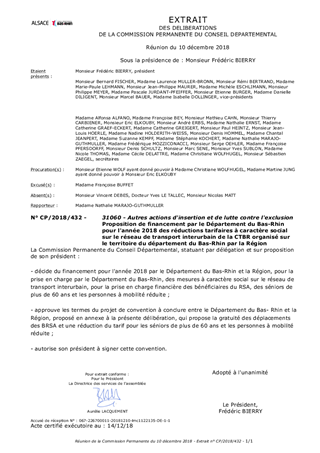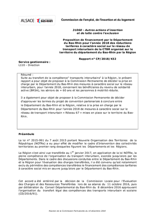 Proposition de financement par le Département du Bas-Rhin pour l'année 2018 des réductions tarifaires à caractère social sur le réseau de transport interurbain de la CTBR organisé sur le territoire du département du Bas-Rhin par la Région