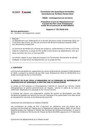 Le Département suit l’élaboration et la révision des plans locaux d’urbanisme (PLU) sur le territoire bas-rhinois, au titre de sa mission de Personne publique associée (PPA) aux documents d’urbanisme. La Commune de Weitbruch a finalisé son projet et, conformément à l'article L123-9 du Code de l’urbanisme, le projet de PLU arrêté a été transmis au Département, afin qu’il fasse connaître son avis, en tant que PPA. Le présent rapport à pour objet de proposer à la Commission Permanente de décider d’adopter le projet d’avis du Département sur le projet de PLU.