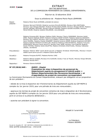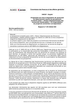 Le groupement d’intérêt public (GIP) « Maison Départementale des Personnes Handicapées » (MDPH) bénéficie depuis sa création en 2005 de la mise à disposition d’agents du Département du Bas-Rhin. Le présent rapport a pour objet de proposer à la Commission Permanente de décider de la mise à disposition, pour une période de trois ans, à compter du 1er janvier 2019, de 4 fonctionnaires du Département, et d’approuver les termes du projet de convention à conclure entre le GIP MDPH et le Département.