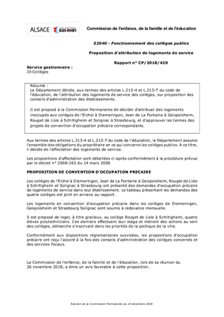 Le Département décide, aux termes des articles L.213-4 et L.213-7 du code de l'éducation, de l'attribution des logements de service des collèges, sur proposition des conseils d'administration des établissements. Il est proposé à la Commission Permanente de décider d'attribuer des logements inoccupés aux collèges de l’Eichel à Diemeringen, Jean de La Fontaine à Geispolsheim, Rouget de Lisle à Schiltigheim et Solignac à Strasbourg, et d'approuver les termes des projets de convention d'occupation précaire correspondants.