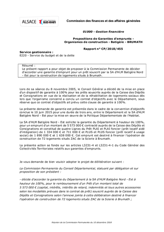 Le présent rapport a pour objet de proposer à la Commission Permanente de décider d’accorder une garantie d’emprunt pour un prêt souscrit par la SA d’HLM Batigère Nord - Est pour la construction de logements situés à Brumath.