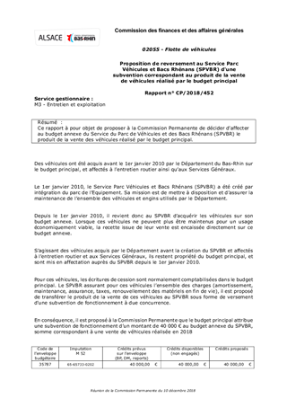 Ce rapport à pour objet de proposer à la Commission Permanente de décider d'affecter au budget annexe du Service du Parc de Véhicules et des Bacs Rhénans (SPVBR) le produit de la vente des véhicules réalisé par le budget principal.