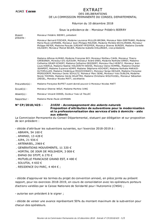 La Caisse Nationale de Solidarité pour l’Autonomie (CNSA) permet, par un conventionnement au titre de la section IV de son budget, de soutenir un plan d’actions visant à améliorer la qualité de la prise en charge des personnes âgées en perte d’autonomie et des personnes en situation de handicap. Par délibération n° CP/2018/220, le Conseil Départemental a approuvé les termes du projet de convention liant le Département et la CNSA. Cet accord porte sur un programme proposé par dix opérateurs du champ de l’autonomie dont les actions contribuent à l’accompagnement des aidants naturels sur le territoire bas-rhinois. Ainsi, la CNSA s’engage à prendre en charge 80% du coût global des actions en versant directement ce soutien au Département. Les opérateurs seront financés par cette recette au moyen d’une convention à conclure avec le Département et assumeront les 20% restants. Le présent rapport a pour objet de proposer à la Commission Permanente de décider d’attribuer des subventions pour la modernisation et la professionnalisation des services d'aides à domicile et d'approuver les termes du projet de convention à conclure entre le Département et chacun des opérateurs.